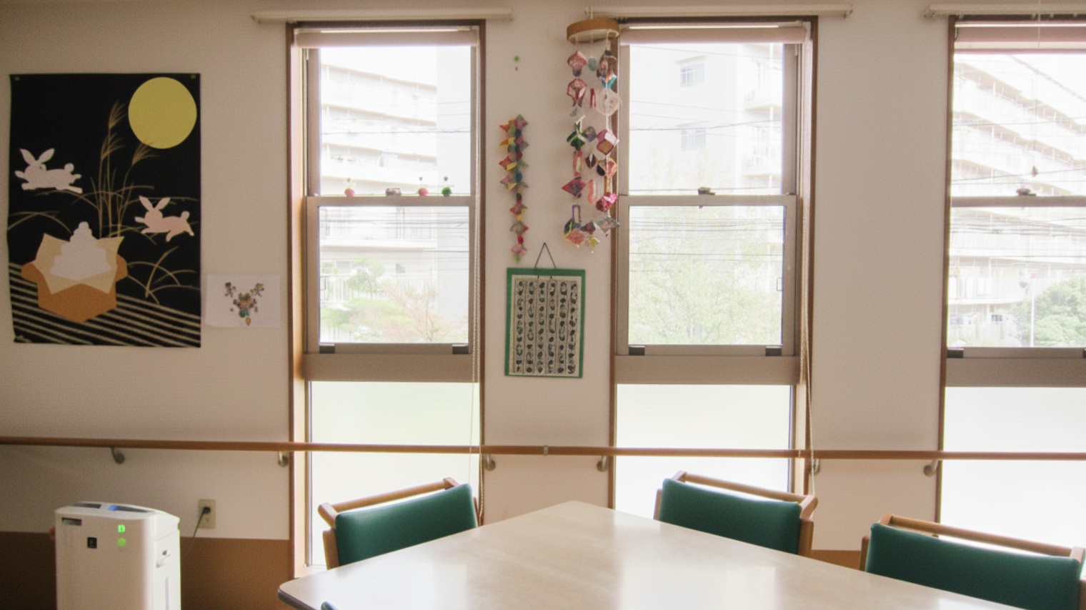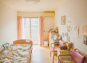 全室個室の居室は、ご自宅の延長のようにくつろげる落ち着いた空間です。大きな窓から自然光が入り、写真のようにお気に入りの写真や飾りを置くことで「自分らしい部屋」に整えていただけます。エアコン・介護ベッドを完備し、スタッフが24時間体制でサポート。静かに過ごしたい時も、皆さんと過ごしたい時も、その日の気分に合わせて心地よい時間をお過ごしいただけます。