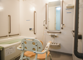 浴室には複数の手すりが配置され、座ったまま安心して入浴できる設備が整っています。浴槽には滑り止めマットを敷き、立ち上がりの負担を軽減できるチェアもご用意。介助が必要な方でも、スタッフの見守りのもと安全に入浴いただける環境です。毎日の入浴を無理なく、そして心地よく。そのための工夫を細部にまで凝らしています。
