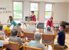 グループホーム湘南かさまでは、季節の行事や音楽イベントなど、心がふっと軽くなるひとときを大切にしています。写真のように演奏会の日は自然と笑顔が集まり、懐かしい歌に手拍子を添えたり、お互いに言葉を交わしたりと、あたたかな交流が広がります。スタッフもそばで寄り添い、その方のペースを大切にしながら参加をサポート。家庭的な雰囲気の中で、毎日の暮らしに彩りを添える時間がここにあります。