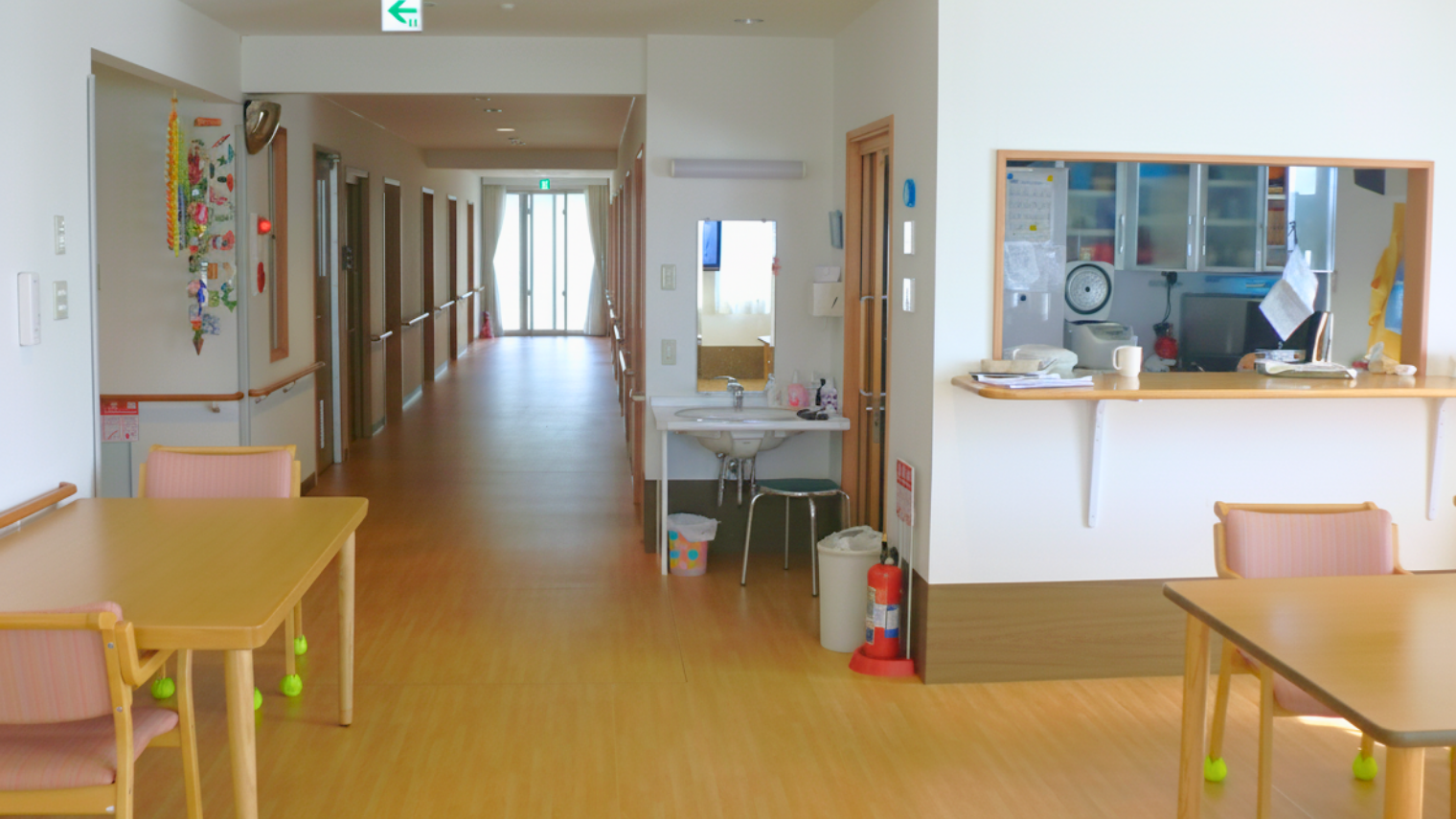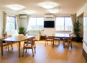 大きな窓から光が入り込む食堂は、毎日の食事や団らんの中心となる空間です。仕切りのないレイアウトで、入居者様同士やスタッフとの会話が自然に生まれ、穏やかで家庭的な雰囲気が広がります。日常生活の中で交流が生まれる、温かい「憩いの場」としてご利用いただけます。