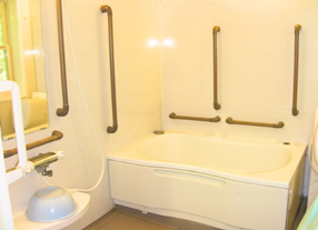 浴室には手すりを多く配置し、転倒を防ぐための工夫が細やかに施されています。足元が不安定な方や車椅子をご利用の方も、スタッフの丁寧な介助により、安全にゆっくりとご入浴いただけます。明るく清潔な空間はリラックスしやすく、その日の体調に合わせて無理なく利用できるのも特徴です。「気持ちいいね」と笑顔がこぼれる、心と体をやさしくほぐす入浴時間をご提供しています。