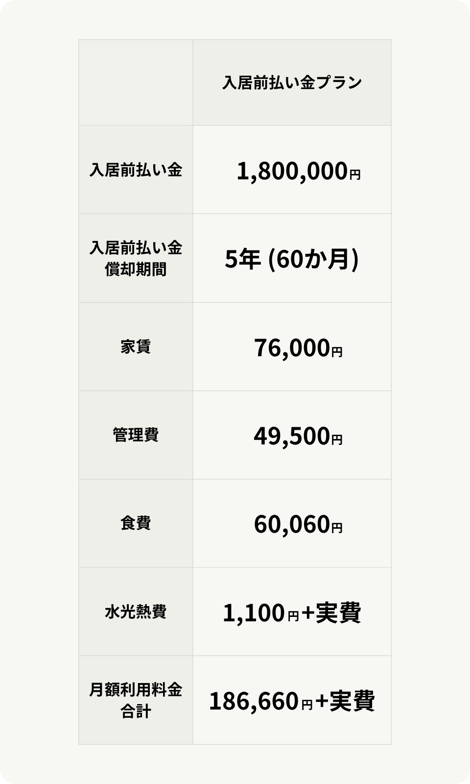 ※入居前払い金は想定居住期間を超えて契約が継続する場合に備えて受領する額(30%)を入居日の3か月後に償却し、想定居住期間内家賃を入居後から月次償却(償却期間は居室/介護度/ご年齢により異なります)します。想定居住期間内の退去の場合は、想定居住期間を超えて契約が継続する場合に備えて受領する額を除き、入居期間に応じて未償却額を返還させていただきます。