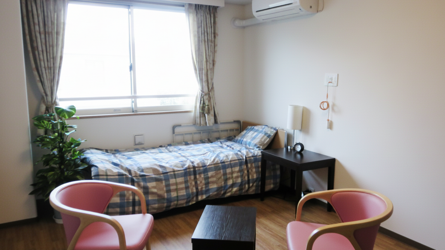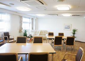 食堂兼談話室は、大きな窓から陽光が差し込む開放的な空間です。お食事はもちろん、レクリエーションや会話の場としても活用され、自然と笑顔が生まれます。木のぬくもりを感じる明るい室内は、ご入居者様同士の交流を育む憩いの場所。ゆったりとした時間をお過ごしいただけます。